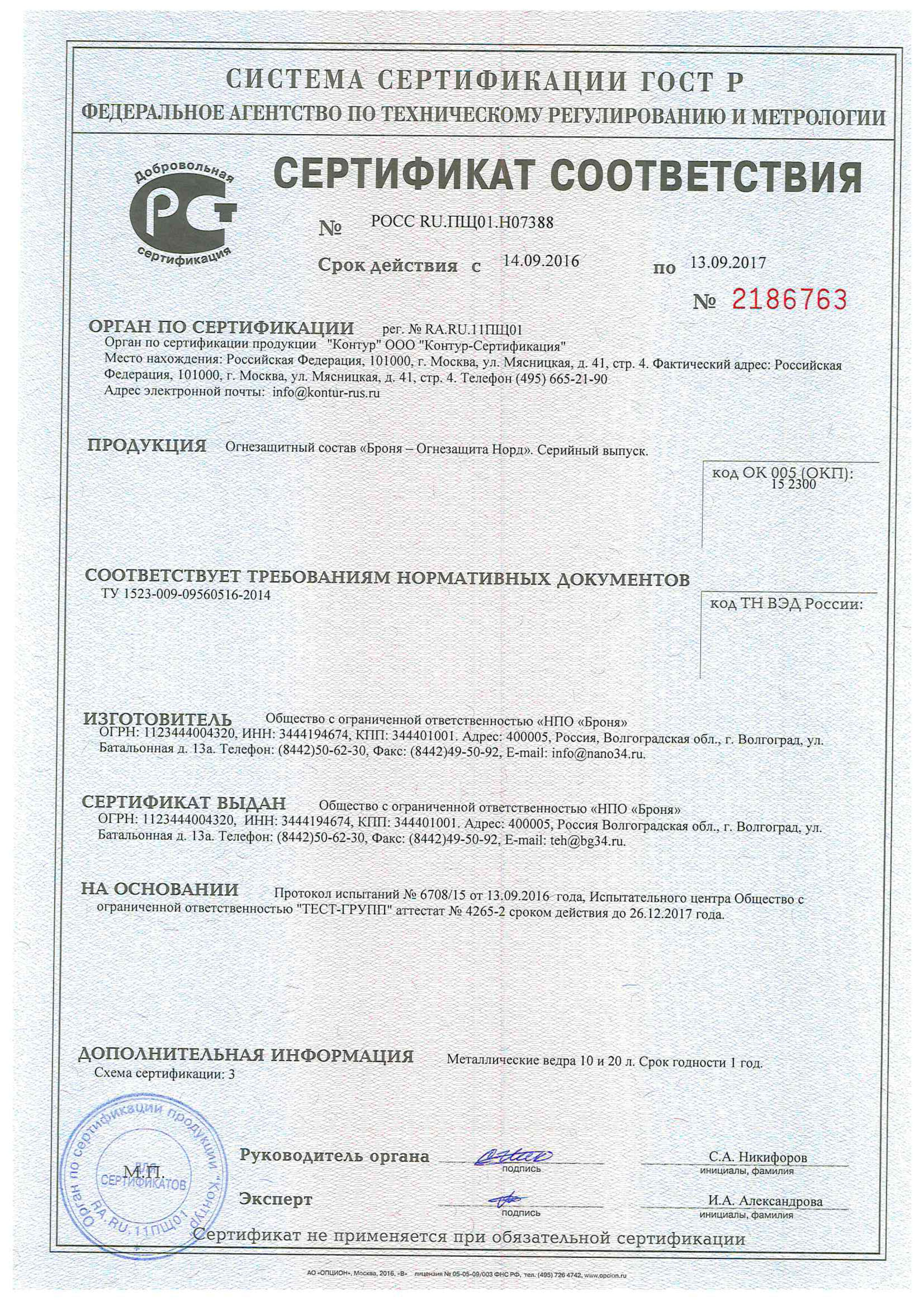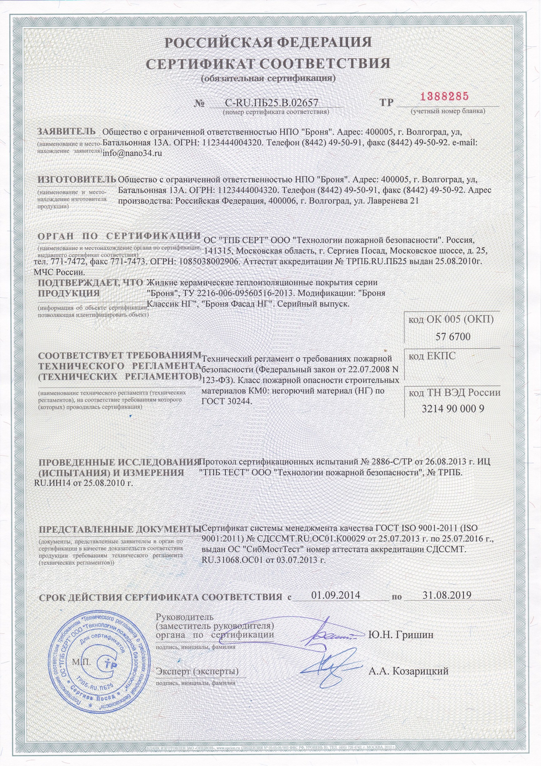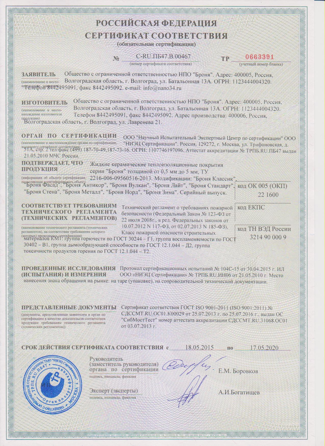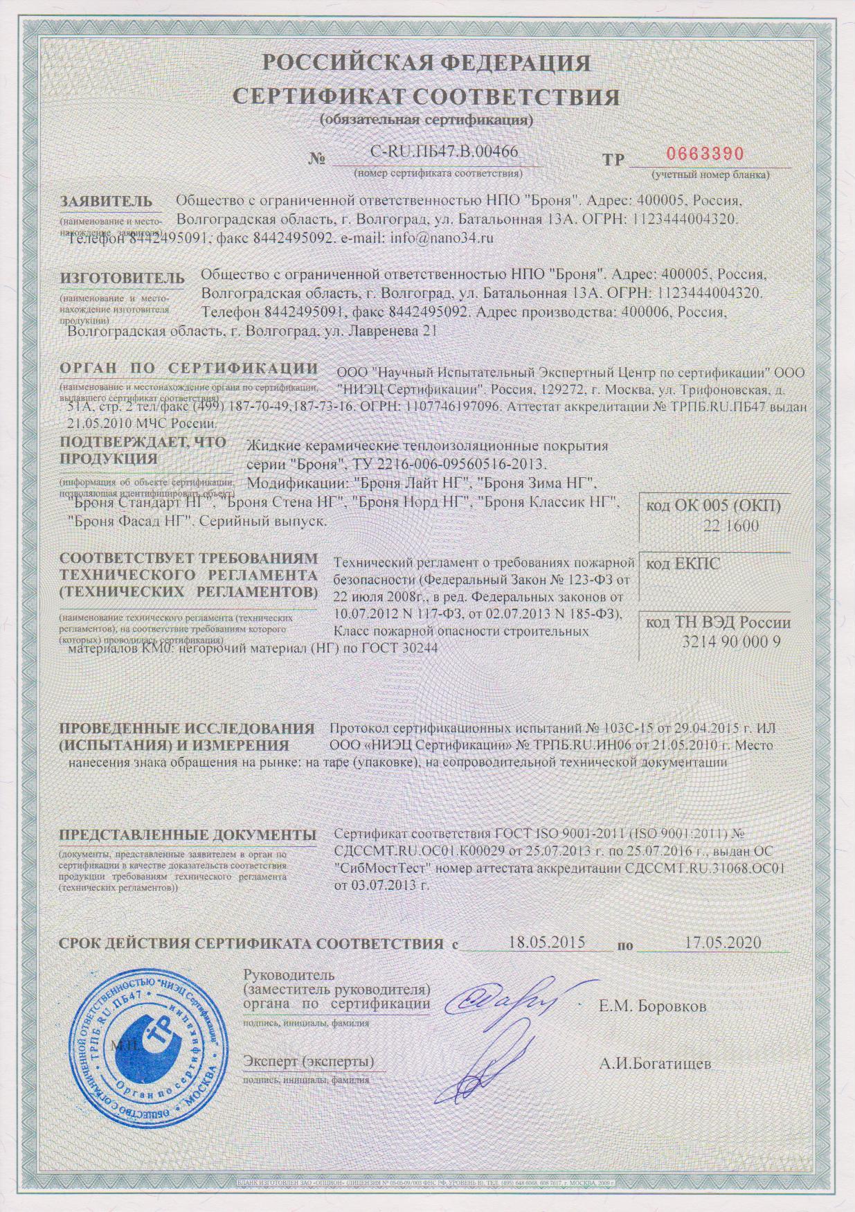 러시아 인증서발급기관 방염증서, NC-전제품
