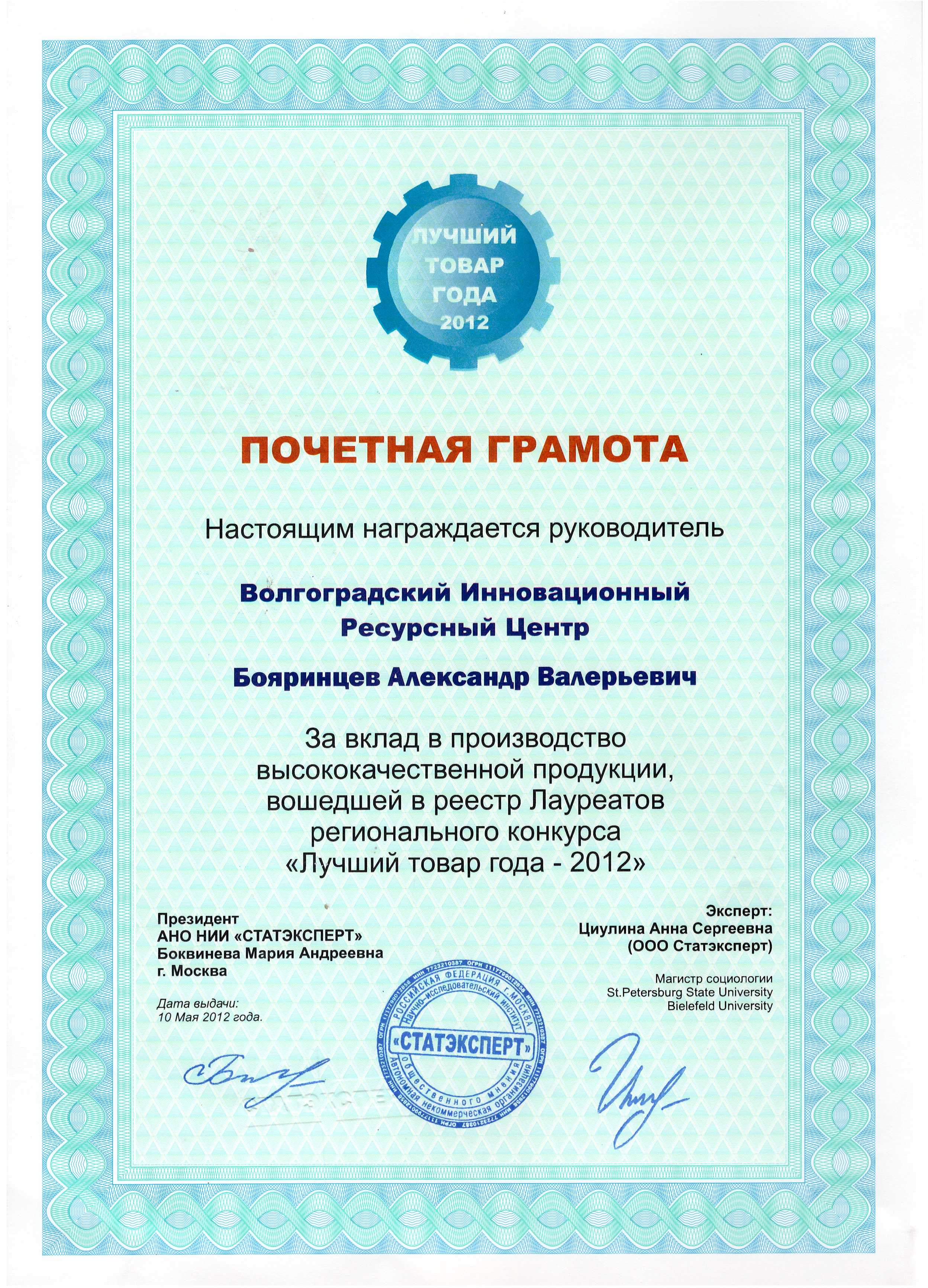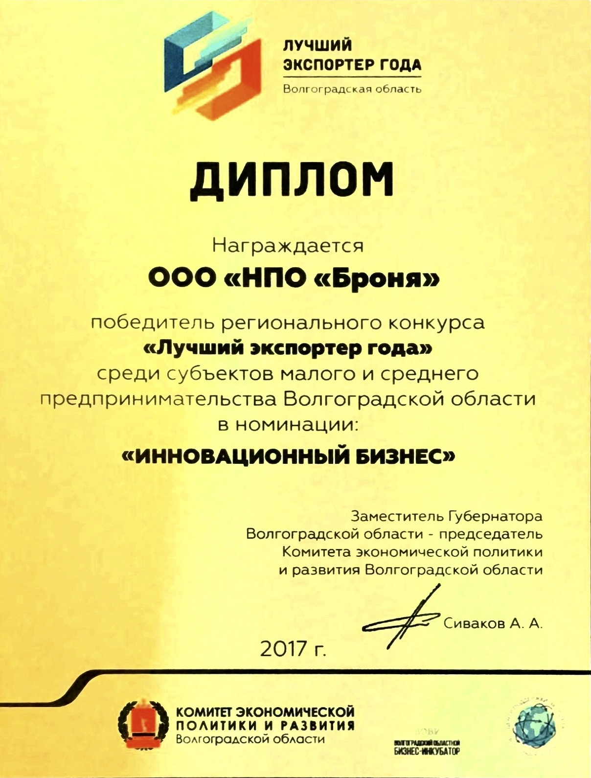 러시아 볼고그라드주 2017년 최고수출업체상취득