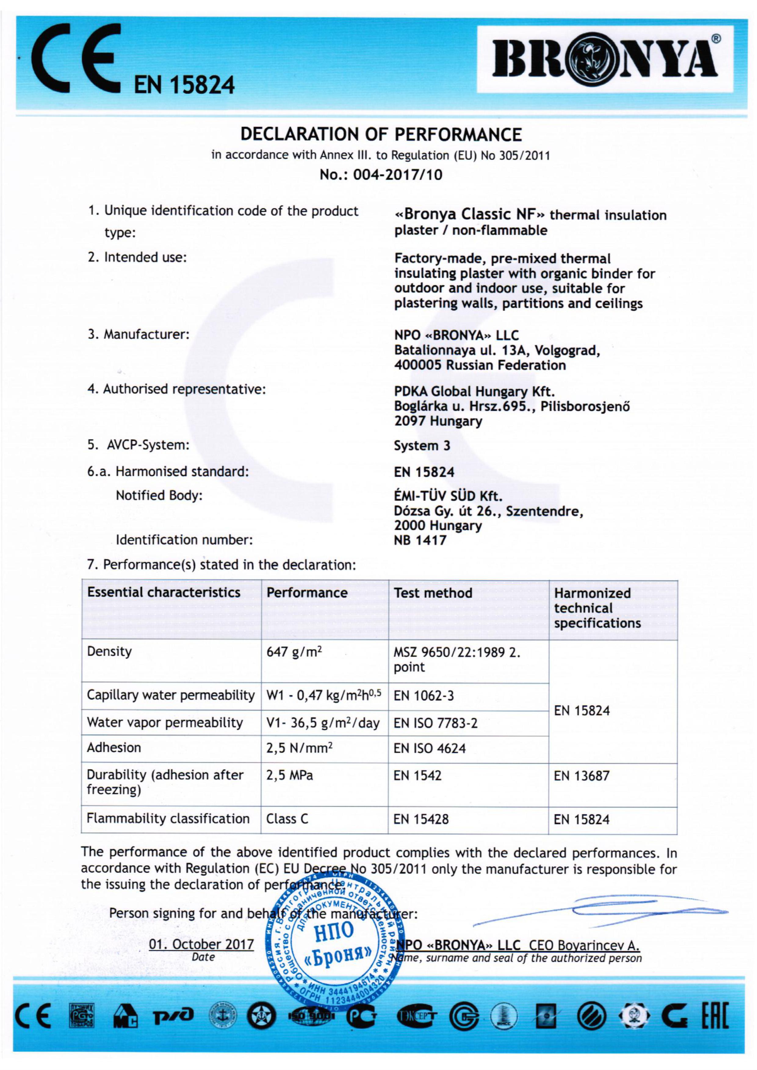 CLASSIC NC, FASADE NC 불연성 인증서
