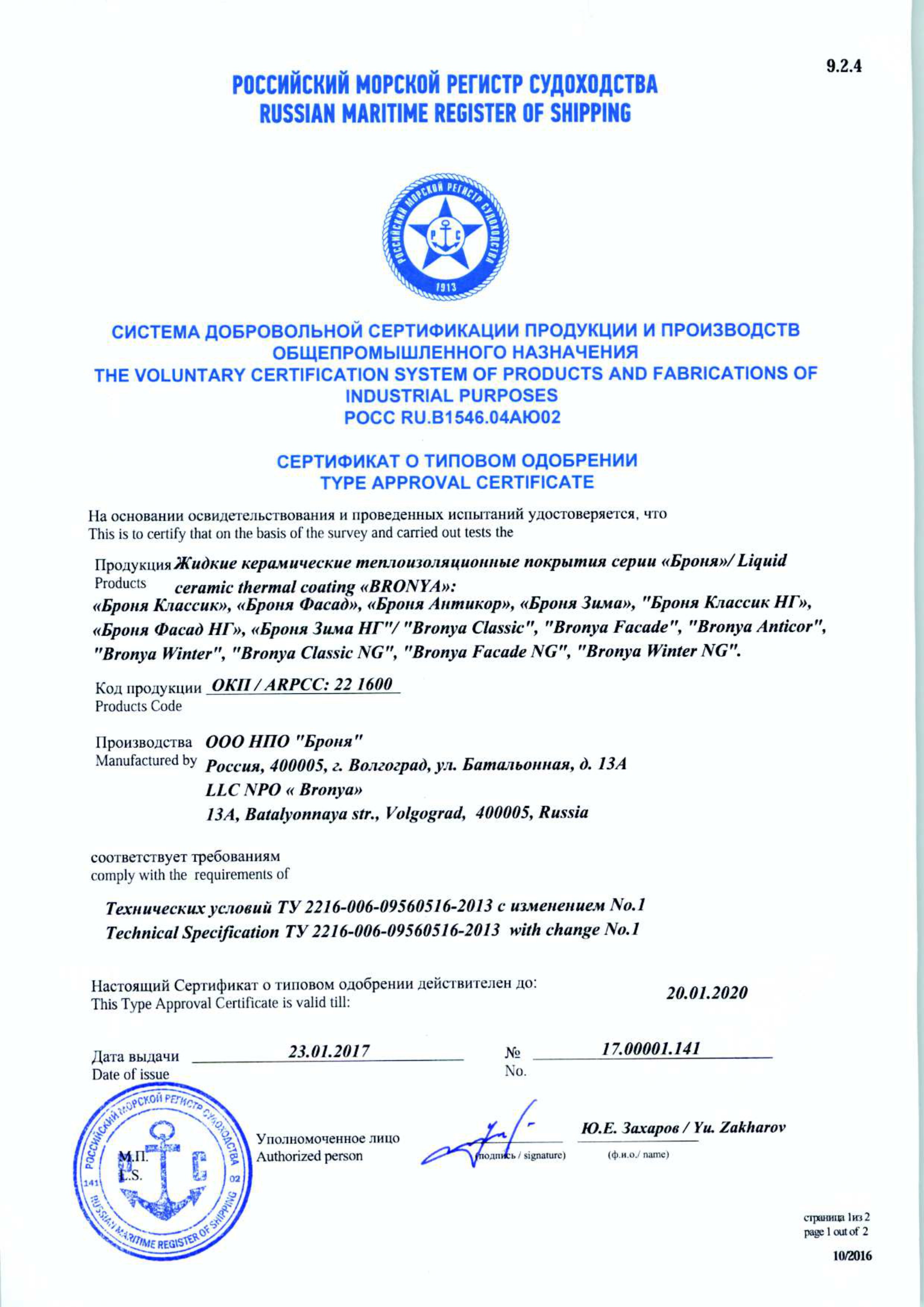 러시아 선급혐회 발행 제품 인증서