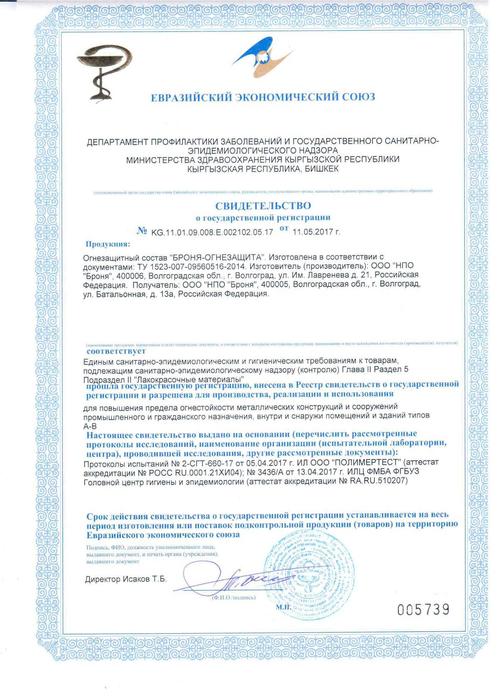 유라시아 경제연합 발급 FIREPROTECTION 내화성 인증서